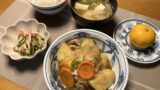 じゃがいも団子入り具沢山味噌汁、厚焼き玉子、手作り餃子、ご飯