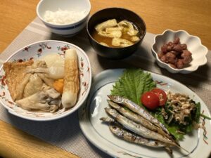 焼き鮭、もやしと揚げかまぼことしいたけの甘辛炒め、おからの炒り煮、