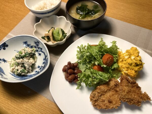 ヒレカツ、カボチャのサラダ、金時豆の煮豆