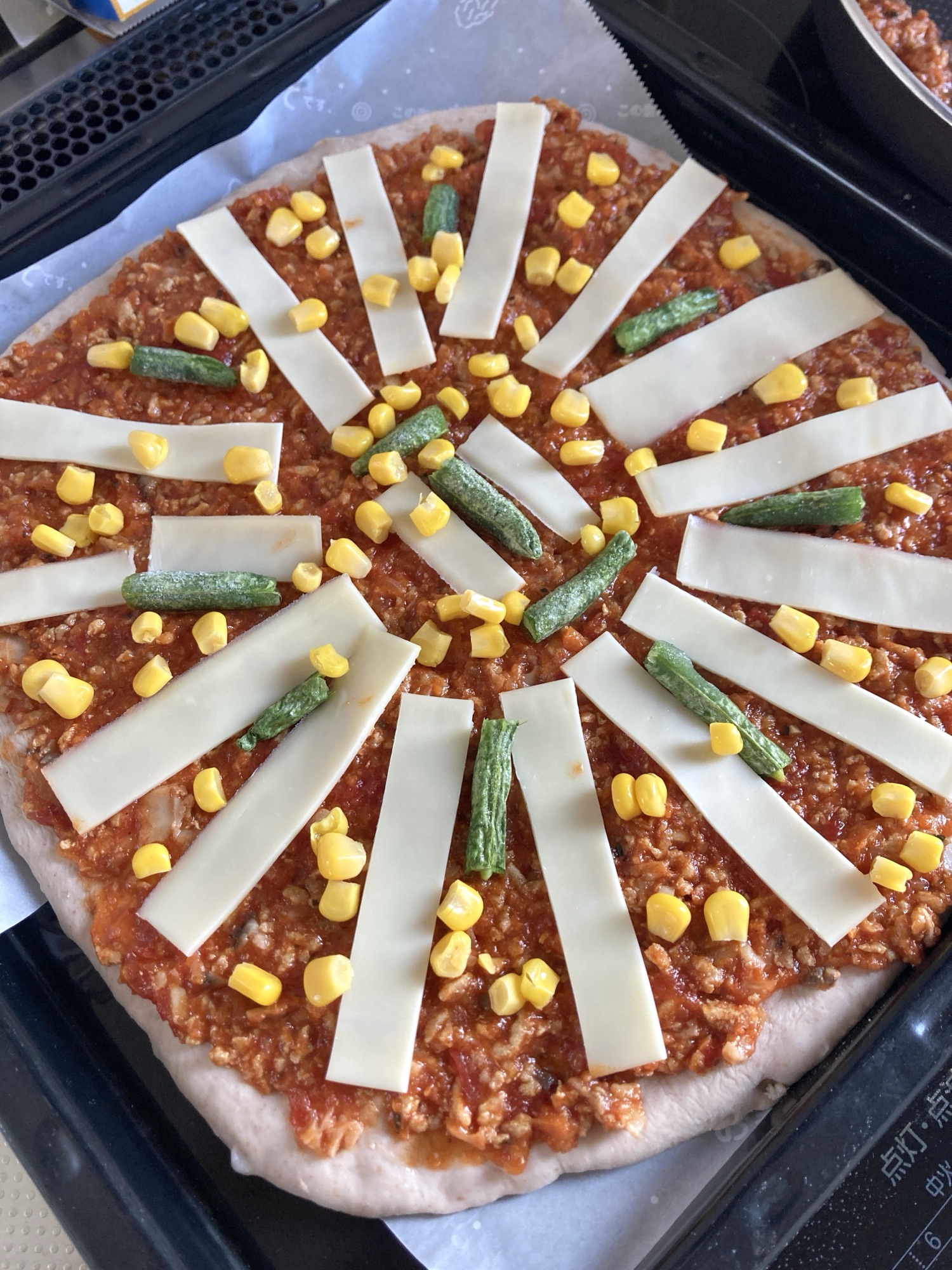 モツァレラチーズとコーン、冷凍インゲンをトッピング