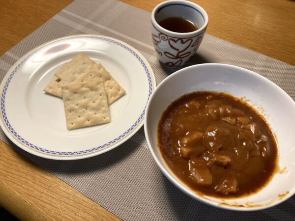 検査食のビーフシチューとクラッカー